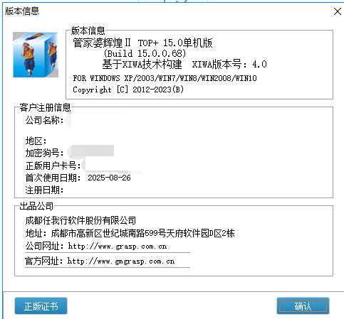 3. 获取版本信息中的“公司名称”,“加密狗号”,“正版用户卡号”等被验证信息。图片中圈红部分。